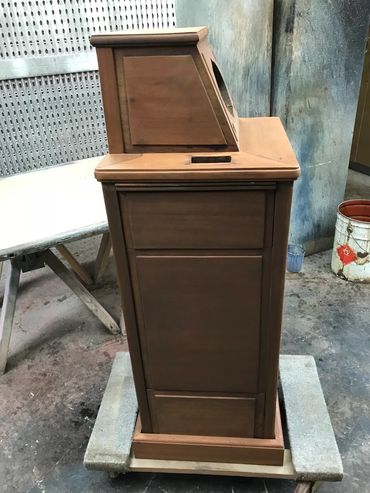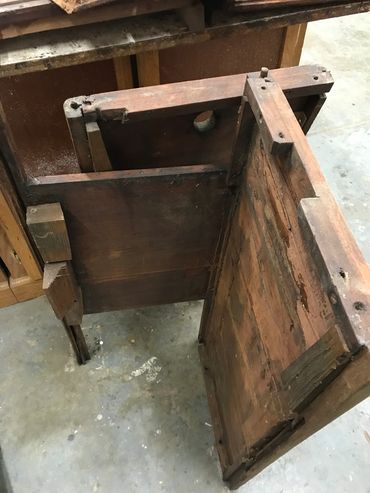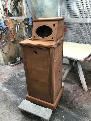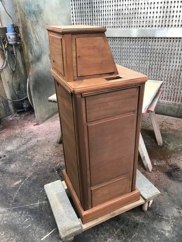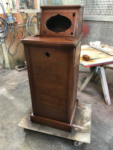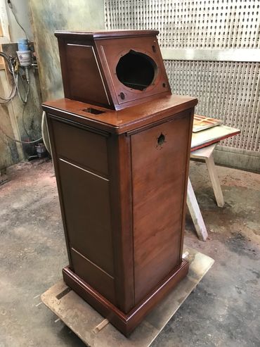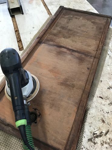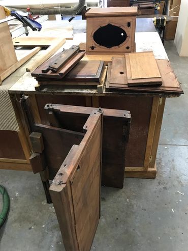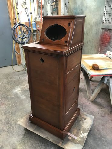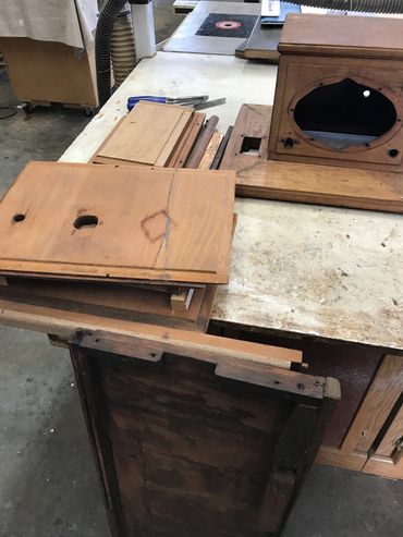 We received this 1949 Philco radio cabinet in pretty bad shape. Twenty years in a damp basement storage had almost ruined the wood veneers!